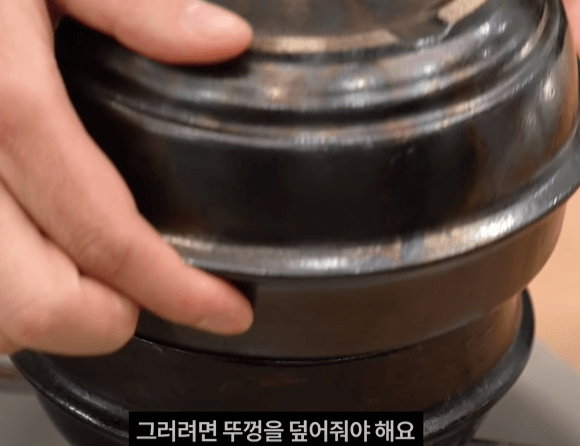 그리고 뚝배기를 덮어주면 달걀물이 부풀어 오르게 된답니다. 뚜껑이 오븐의 역할을 한다고 보시면 됩니다.